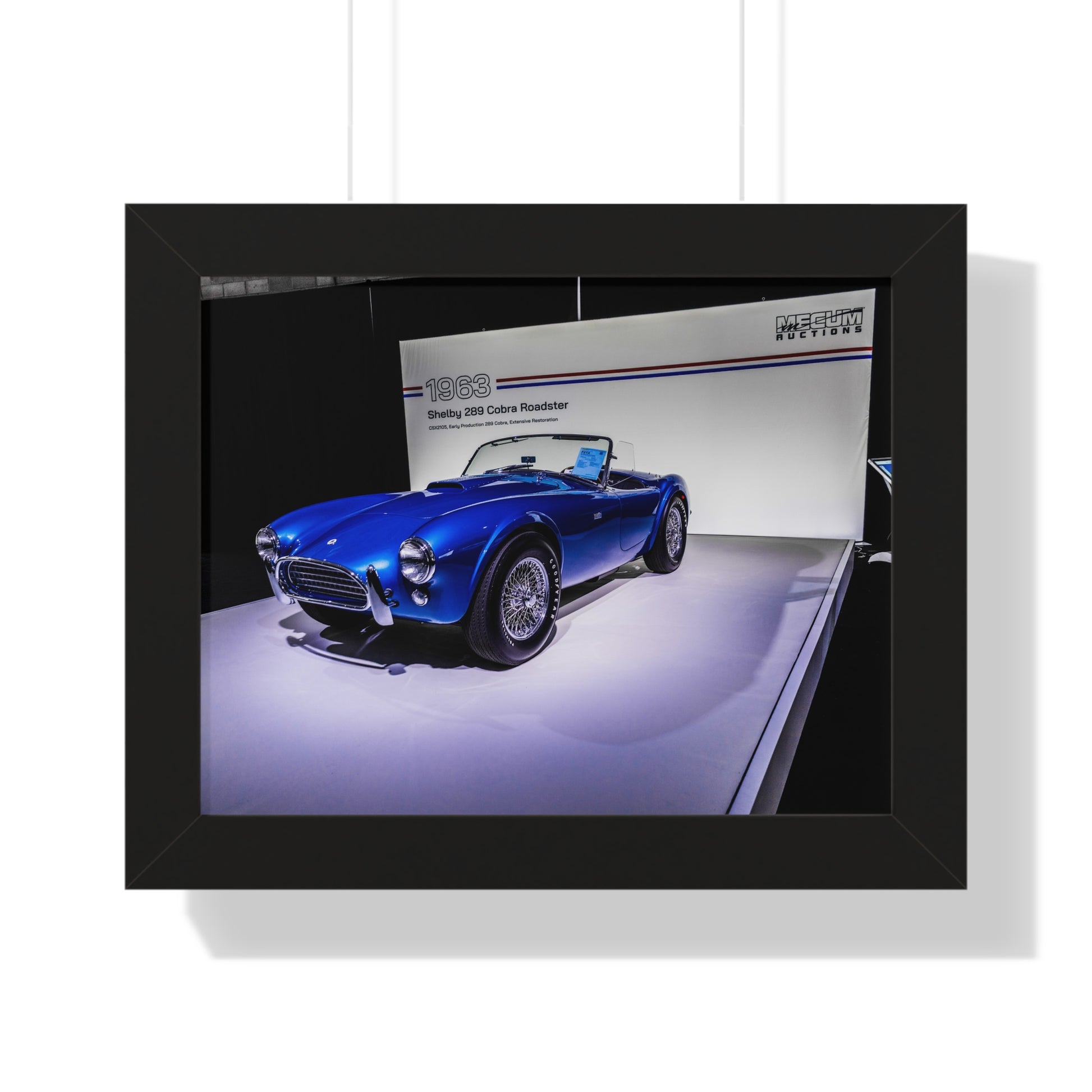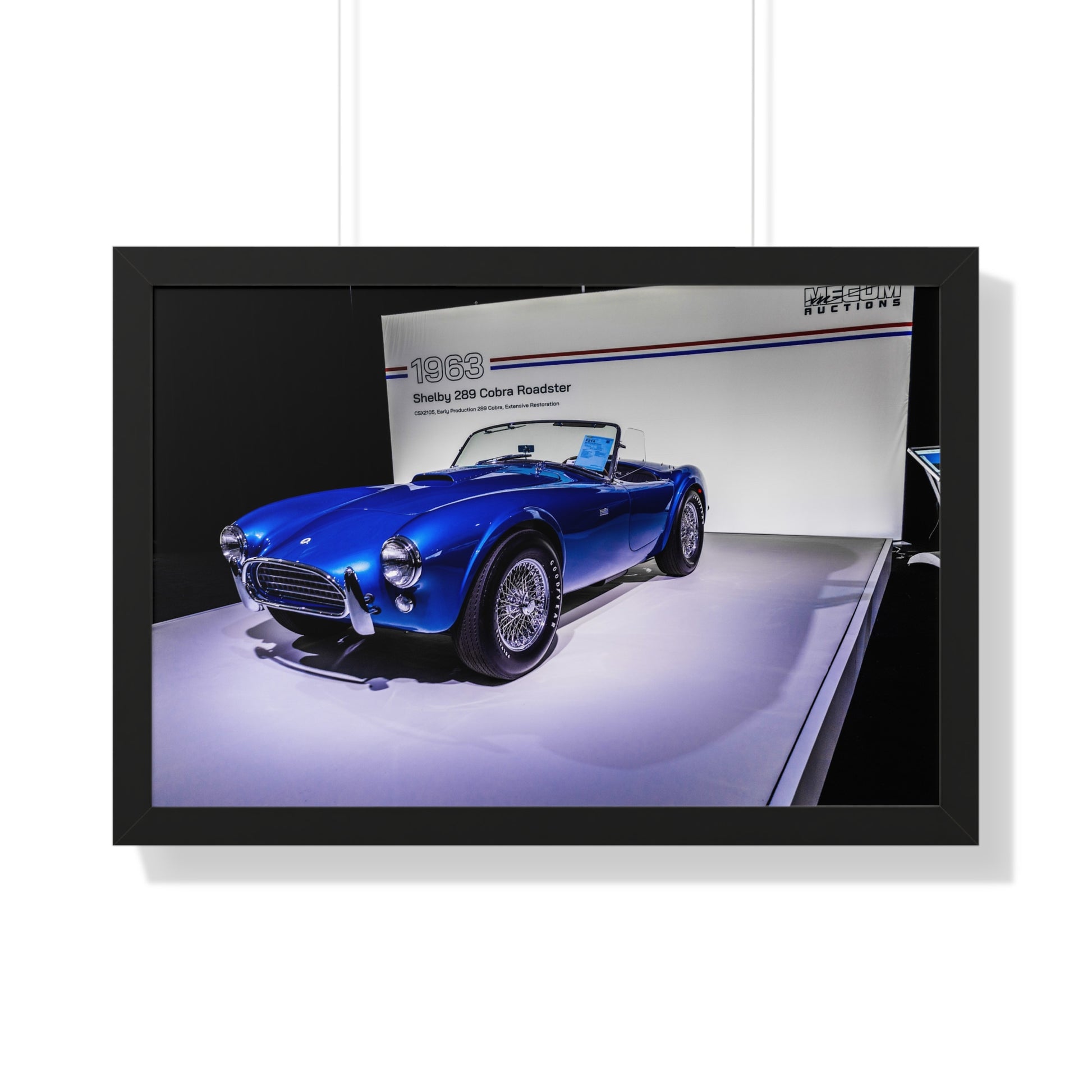 Immerse yourself in automotive history with this stunning photography print of the 1963 Shelby 289 Cobra Roadster, featured at the Mecum Auto Auction. Known for its sleek design and impressive performance, this vibrant blue roadster captures the essence of classic American sports cars. With its elegant lines and distinctive features, the Cobra Roadster is a true icon that appeals to car enthusiasts and collectors alike. Perfect for display in your home, office, or garage, this print celebrates the legacy of one of the most revered roadsters in automotive lore.