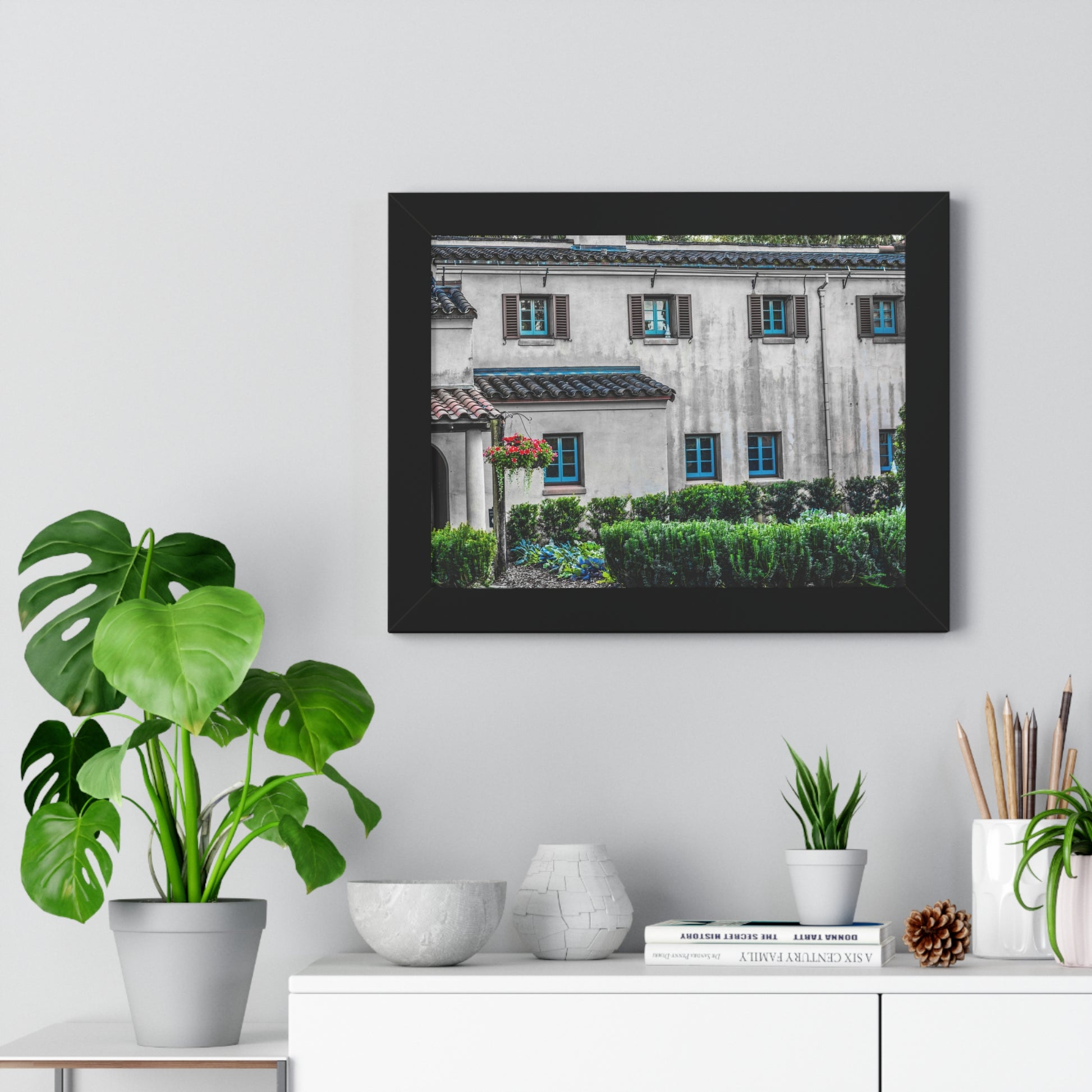 Discover the beauty of architectural elegance with this captivating photography print of a charming building. The unique blend of textures, from the stucco walls to the tiled roof, is beautifully complemented by vibrant blue windows and colorful hanging flowers. This image captures the essence of quaint charm and character, making it an ideal choice for architecture enthusiasts and lovers of unique designs. Perfect for enhancing your home or office decor, this print adds a touch of sophistication and warmth to any space.