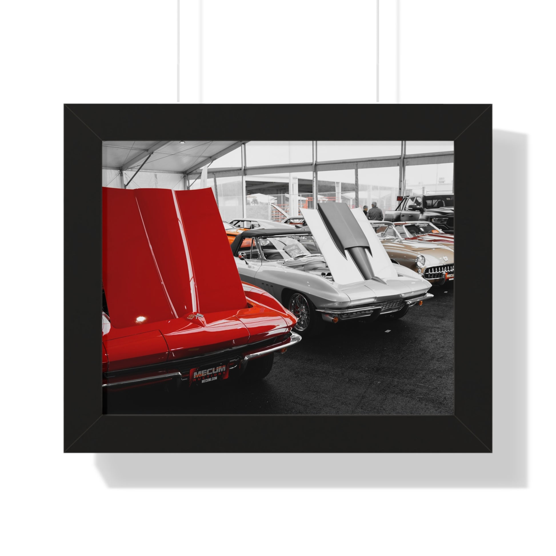 Immerse yourself in the world of vintage automobiles with this captivating photography print from the Mecum Auto Auction. Featuring an array of classic cars with their hoods raised, this image highlights the beauty and craftsmanship of automotive design. The striking contrast between the vibrant red and silver hoods against the backdrop of other classic vehicles creates a dynamic scene that celebrates the rich history of American muscle and sports cars. Perfect for any car enthusiast's collection, this print adds a touch of nostalgia and style to your home, office, or garage.