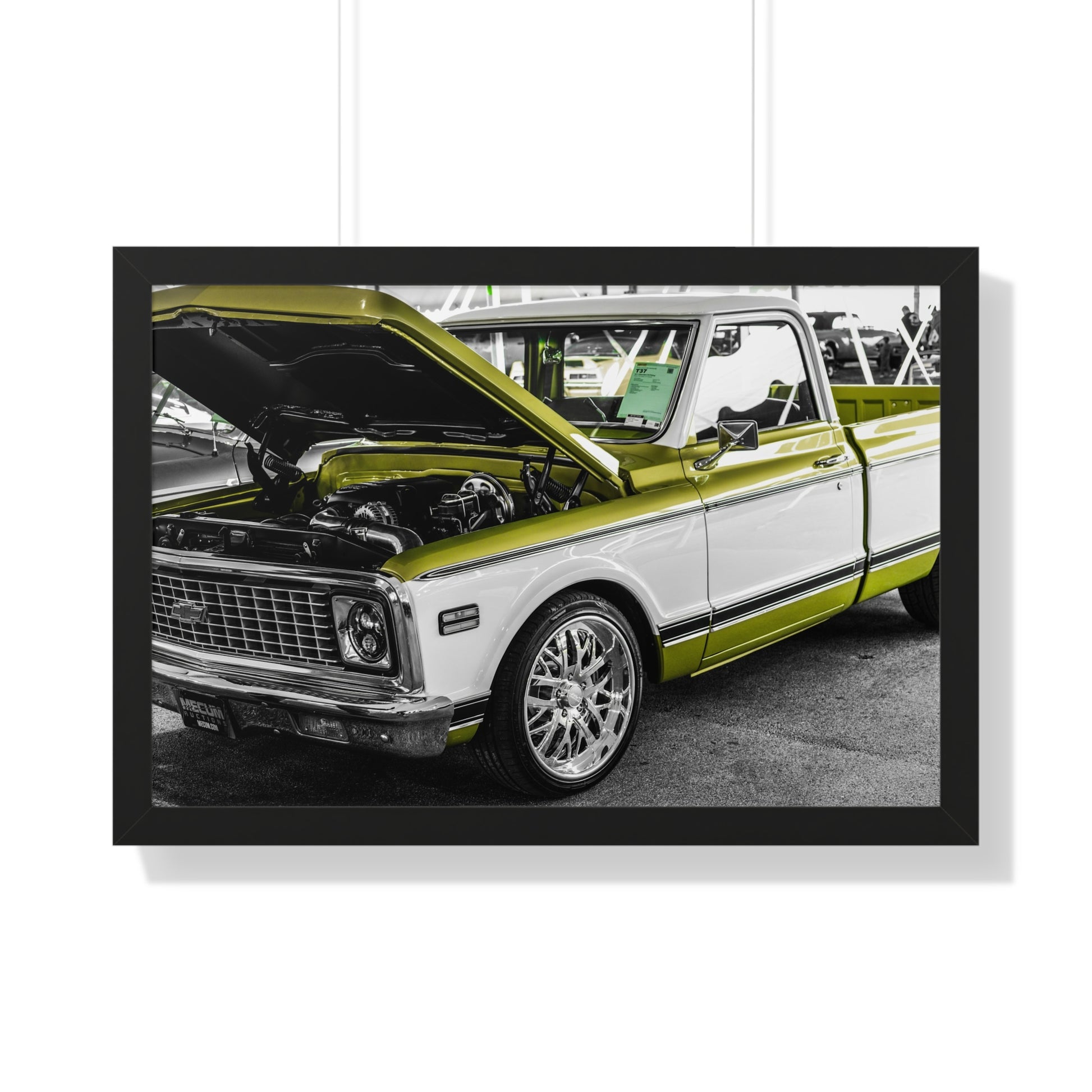 Celebrate the craftsmanship of American automotive design with this stunning photography print of a classic Chevrolet truck, displayed at the Mecum Auto Auction. Featuring a striking two-tone green and white exterior, this vehicle showcases meticulous restoration and attention to detail. The open hood reveals the powerful engine, emphasizing the blend of vintage style and modern performance. Perfect for display in your home, office, or garage, this print is an ideal addition to any car enthusiast's collection, honoring the legacy of classic trucks.