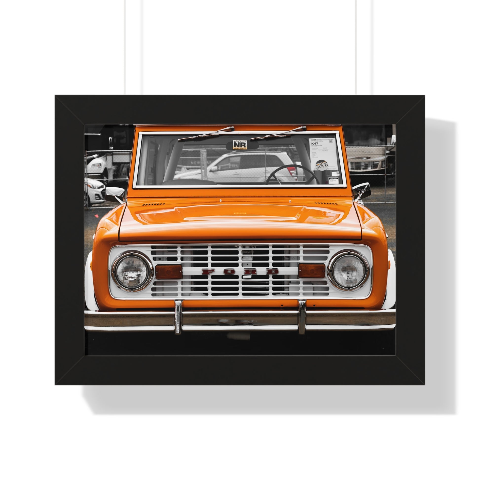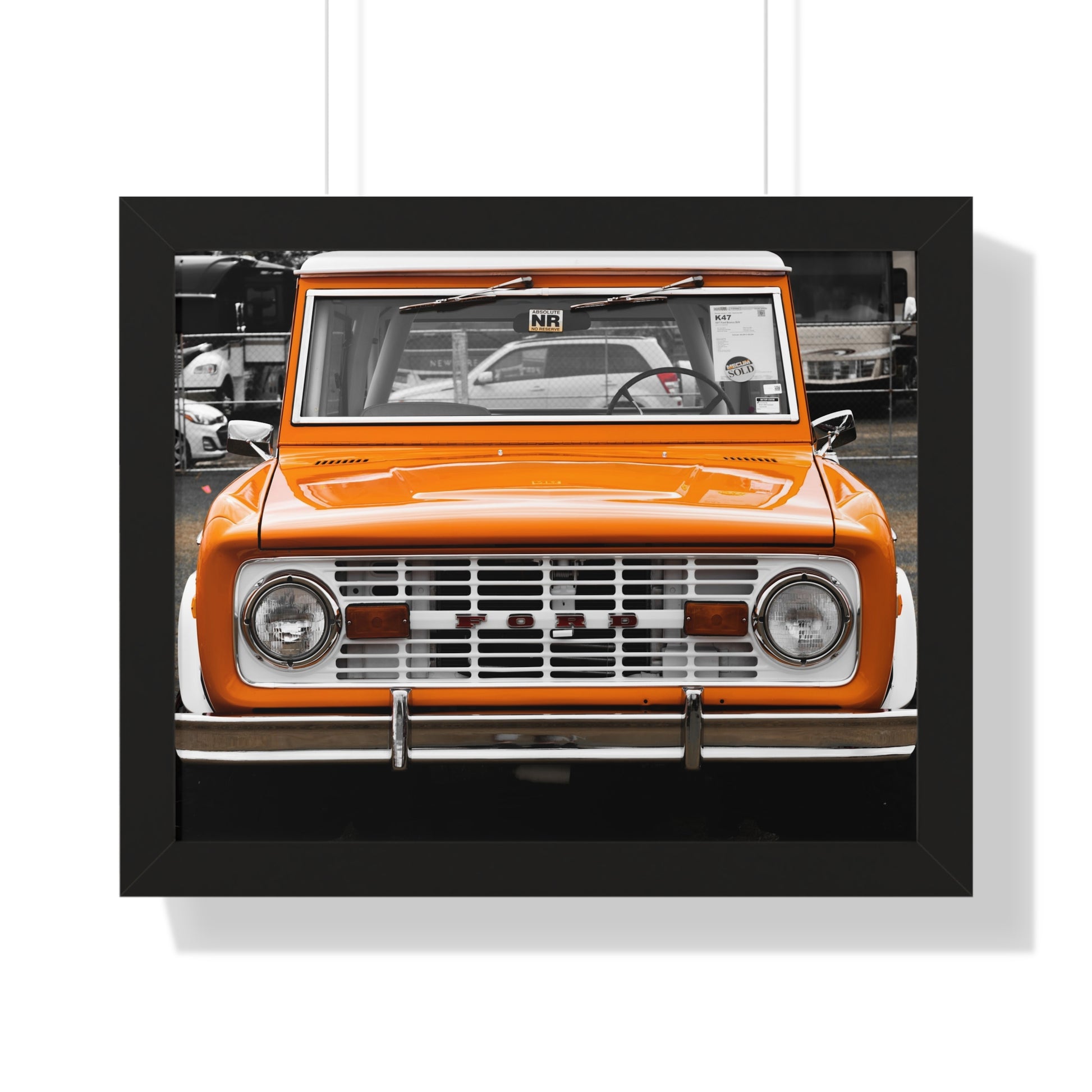 Celebrate the iconic design of the Ford Bronco with this striking photography print, featured at the renowned Mecum Auto Auction. Its vibrant orange exterior and distinctive front grille embody the spirit of adventure and classic automotive craftsmanship. The close-up perspective highlights the Bronco's unique details, making it a perfect addition to any car enthusiast's collection. Ideal for display in your home, office, or garage, this print pays homage to the timeless appeal of this beloved American SUV.