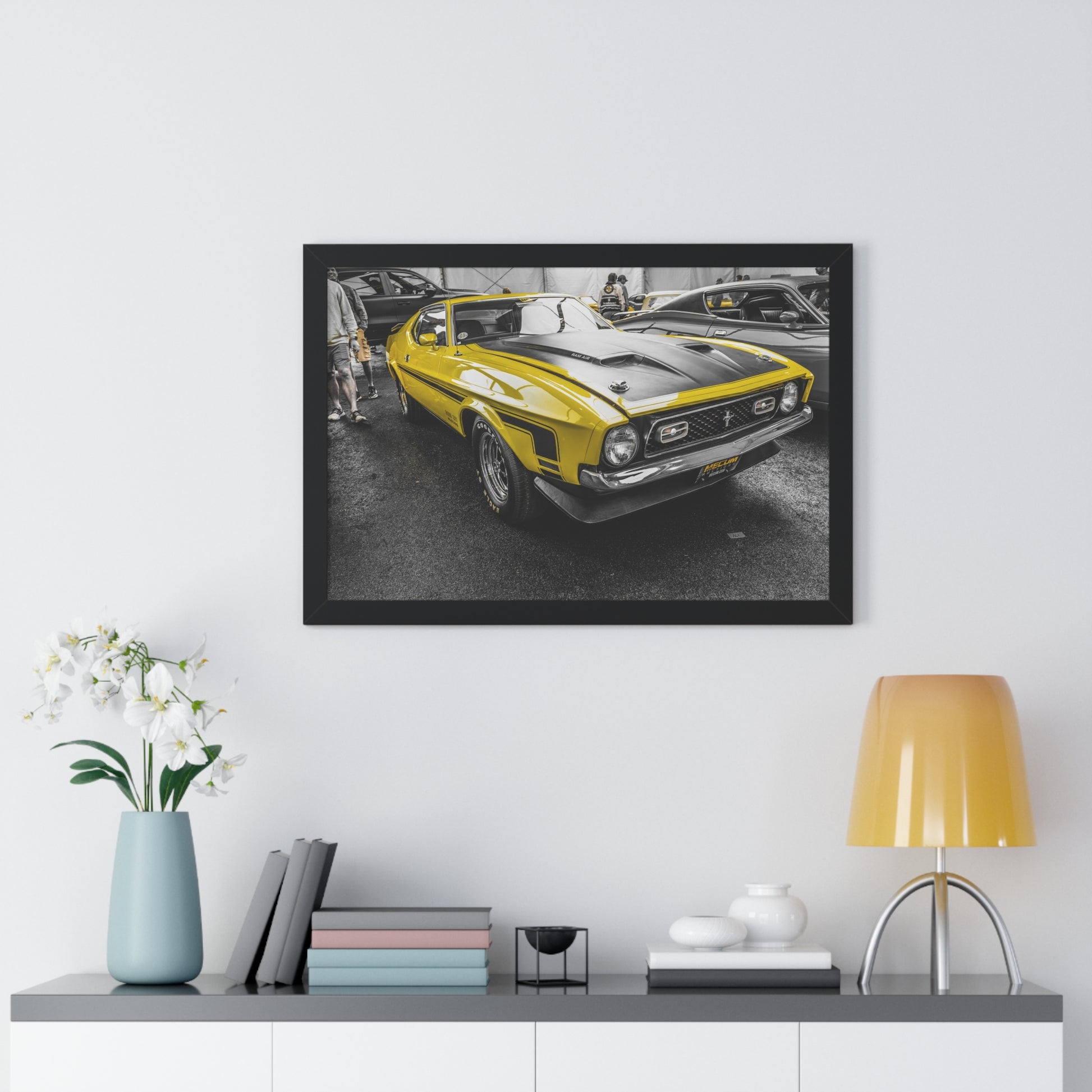 Capture the essence of classic American muscle with this striking photography print of the Ford Mustang Mach 1, showcased at the Mecum Auto Auction. With its vibrant yellow exterior and bold black accents, this iconic vehicle stands out as a symbol of performance and style. Known for its powerful engines and sporty design, the Mach 1 is a beloved choice among car enthusiasts and collectors. This print is perfect for adding a touch of nostalgia and automotive passion to your home, office, or garage, celebrating the legendary legacy of the Mustang.