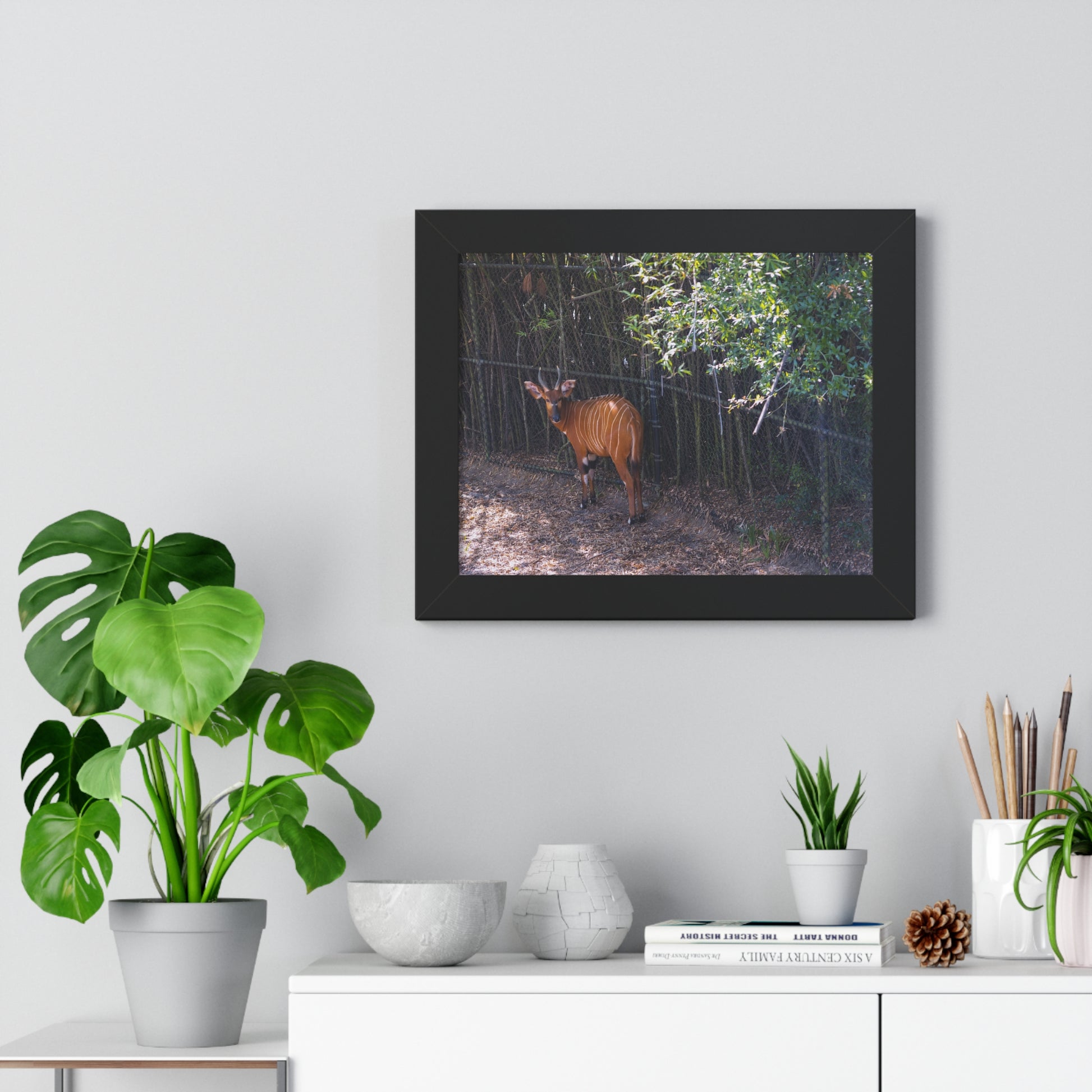 This striking photograph captures a bongo, an elegant antelope, standing near a bamboo backdrop. The rich chestnut color and distinctive white stripes of its coat stand out beautifully against the lush greenery. This image invites viewers to appreciate the unique beauty of this elusive species and the serene environment they inhabit, showcasing the delicate balance of wildlife in nature.