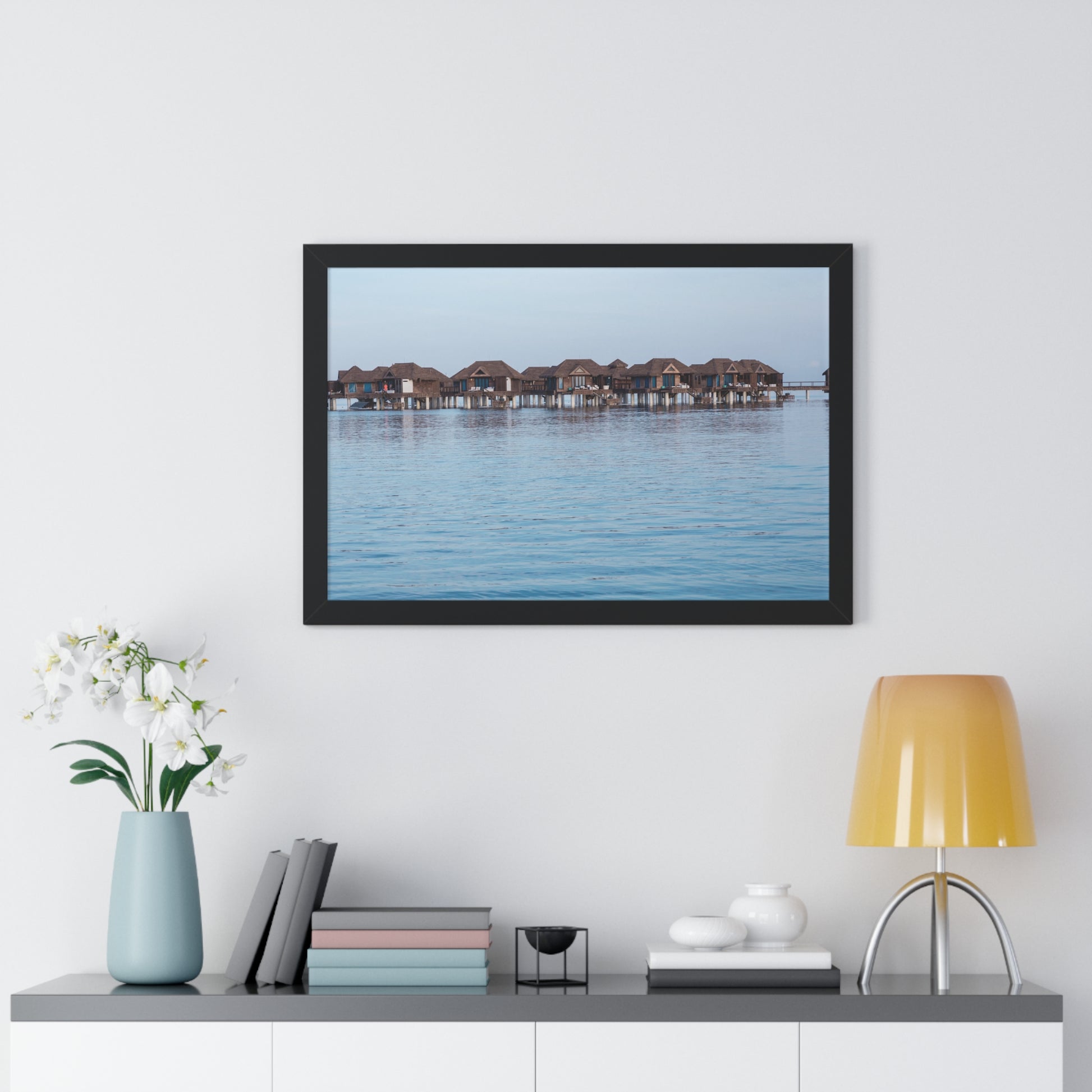Idyllic Retreat: Water Bungalows at Sandals Resort, Jamaica - Framed Photography Print