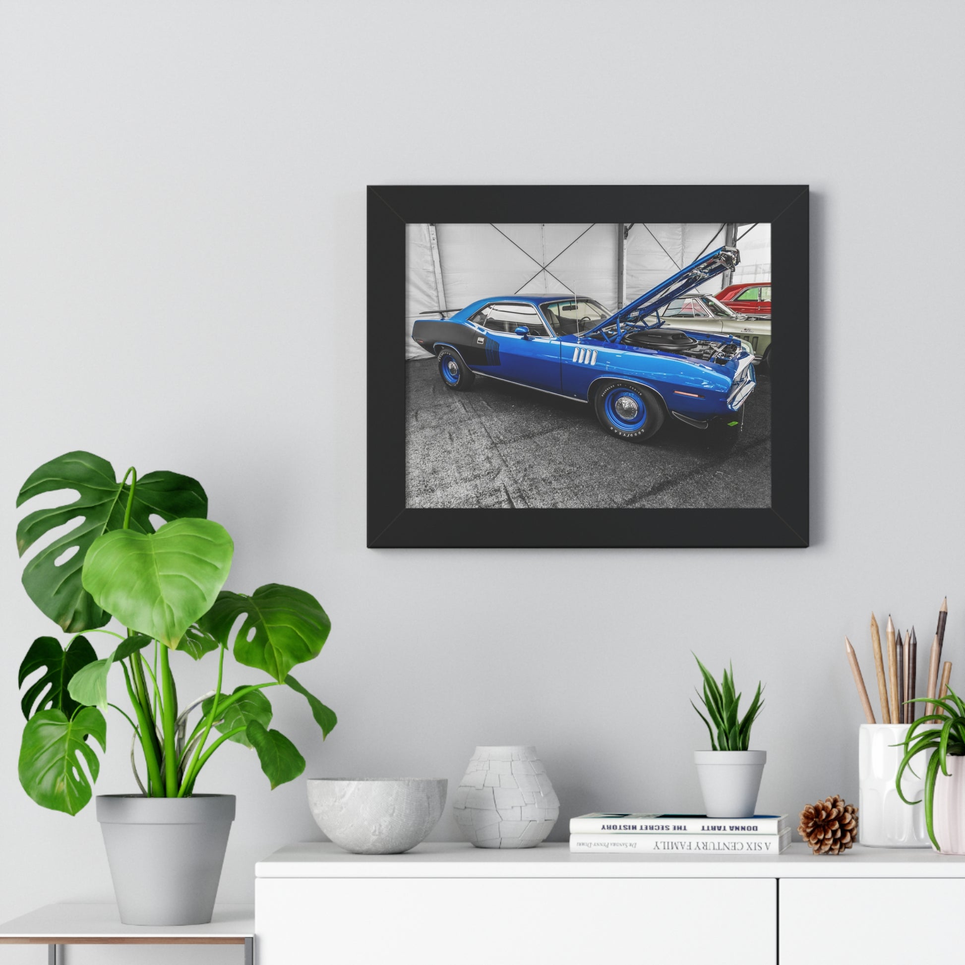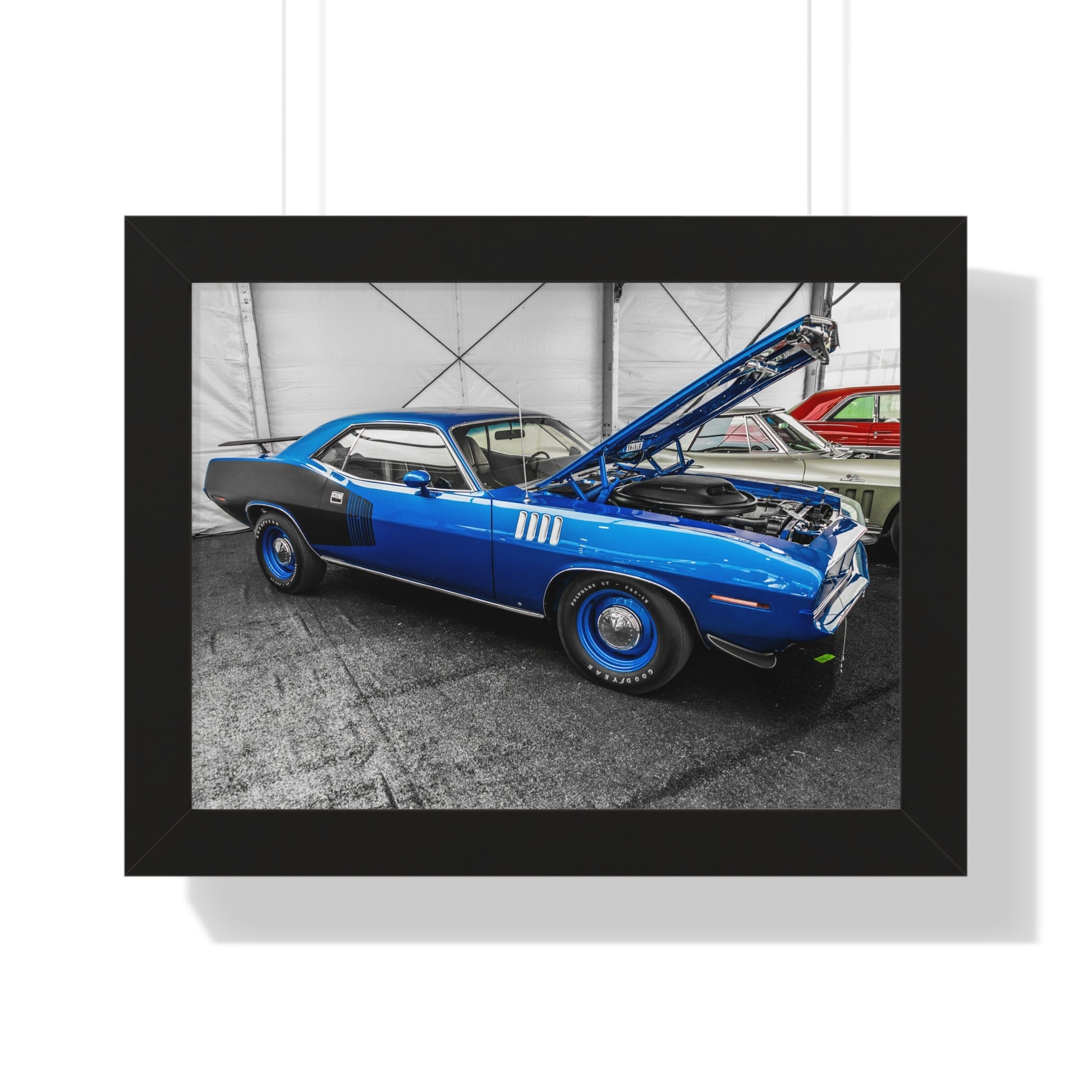 Celebrate the bold design and performance of the Plymouth Barracuda with this captivating photography print, captured at the Mecum Auto Auction. This stunning blue muscle car, featuring a striking black hood and aggressive stance, is a true representation of American automotive history. Known for its powerful engines and iconic style, the Barracuda remains a favorite among collectors and enthusiasts. Perfect for any car lover's collection, this print makes a fantastic addition to your home, office, or garage, showcasing the timeless allure of classic muscle cars.