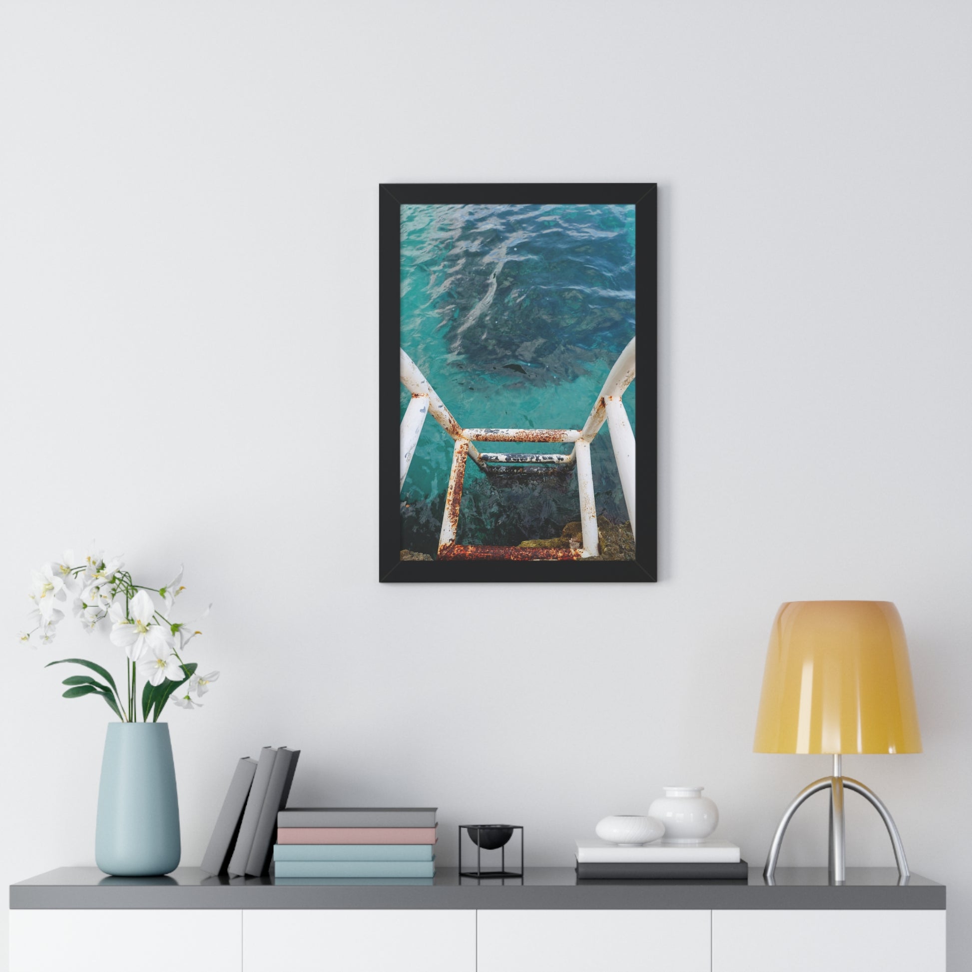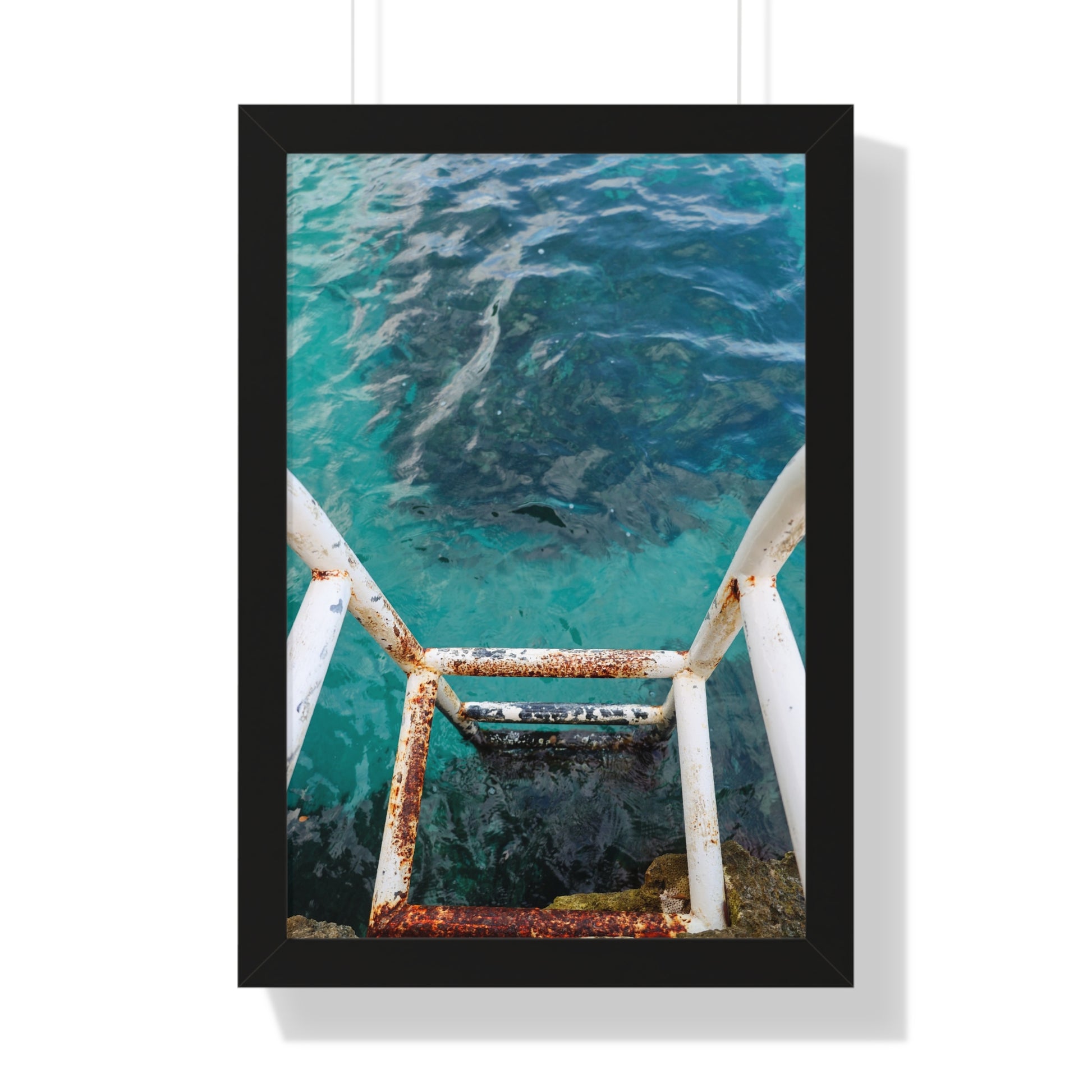 Rustic Descent: Rusted Ladder to Water at The Caves Resort, Jamaica - Framed Photography Print