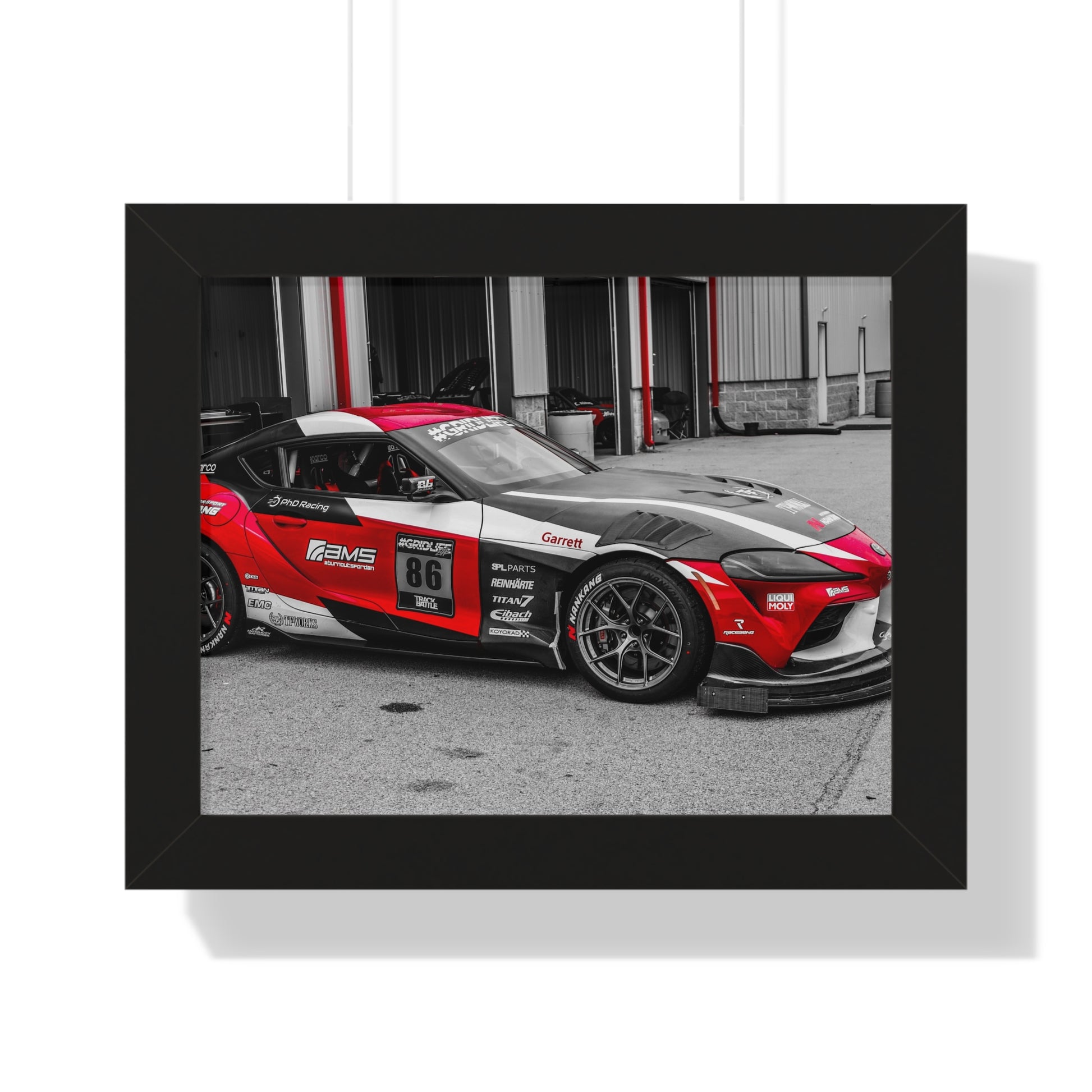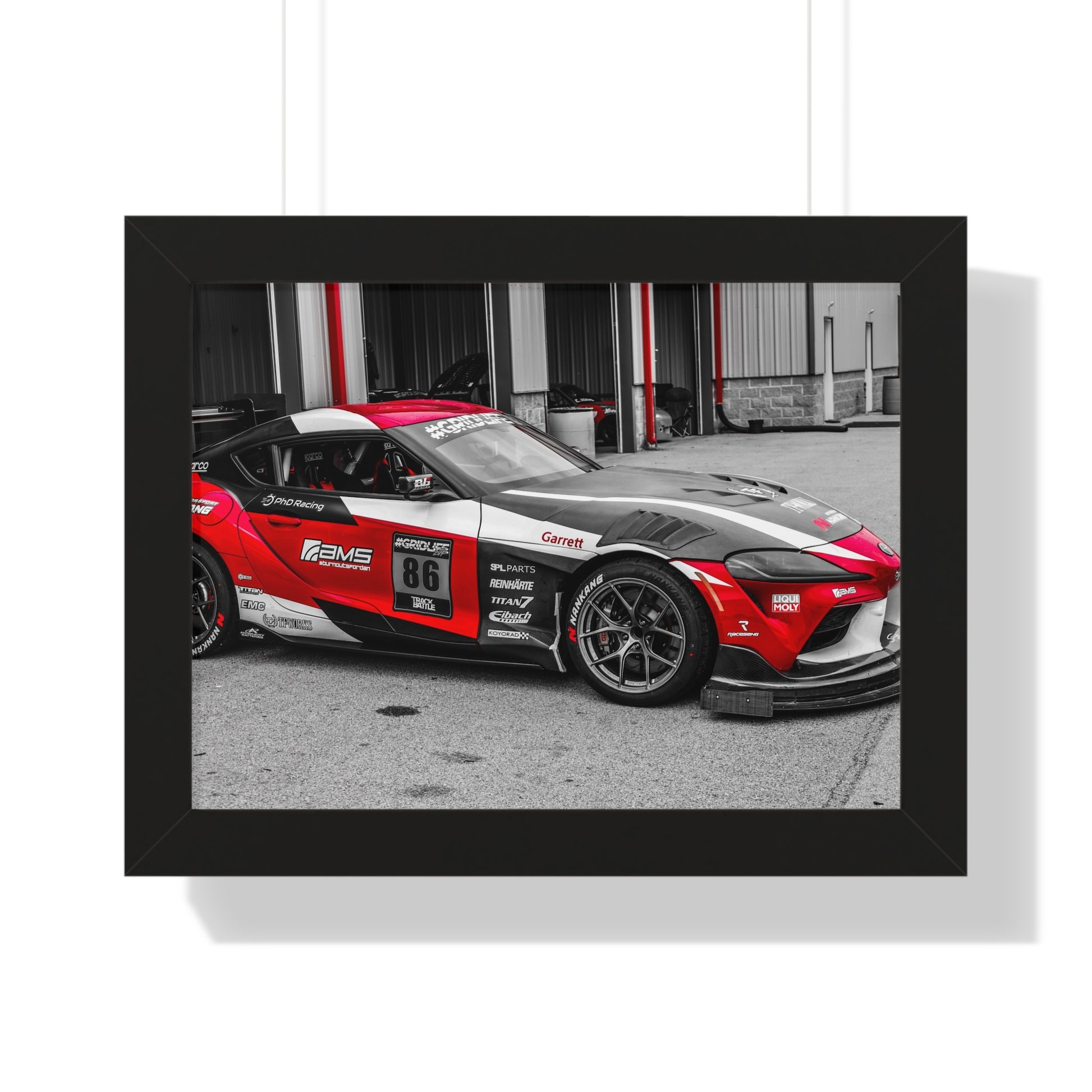 Capture the thrill of automotive excellence with this striking framed print featuring a Toyota Supra showcased at a car show. This artwork highlights the sleek design and powerful presence of this iconic vehicle, making it a perfect addition for car enthusiasts and fans of high-performance motorsport. Bring energy and style to your decor with this captivating piece.
