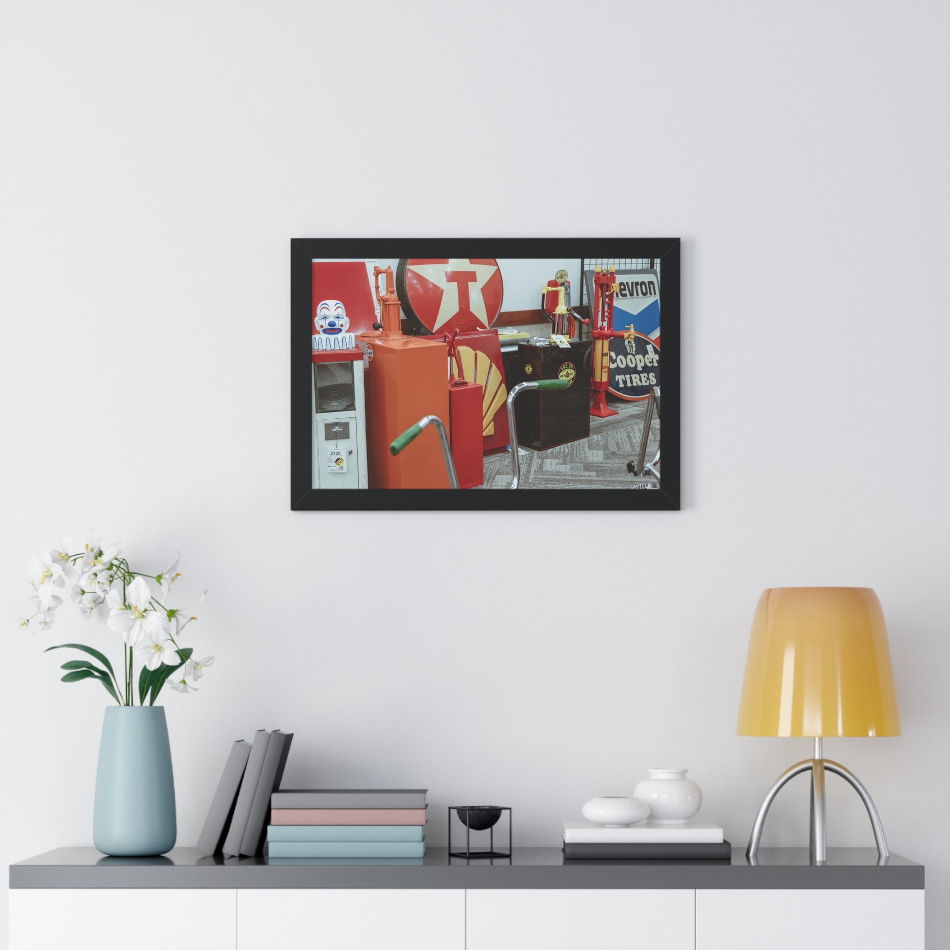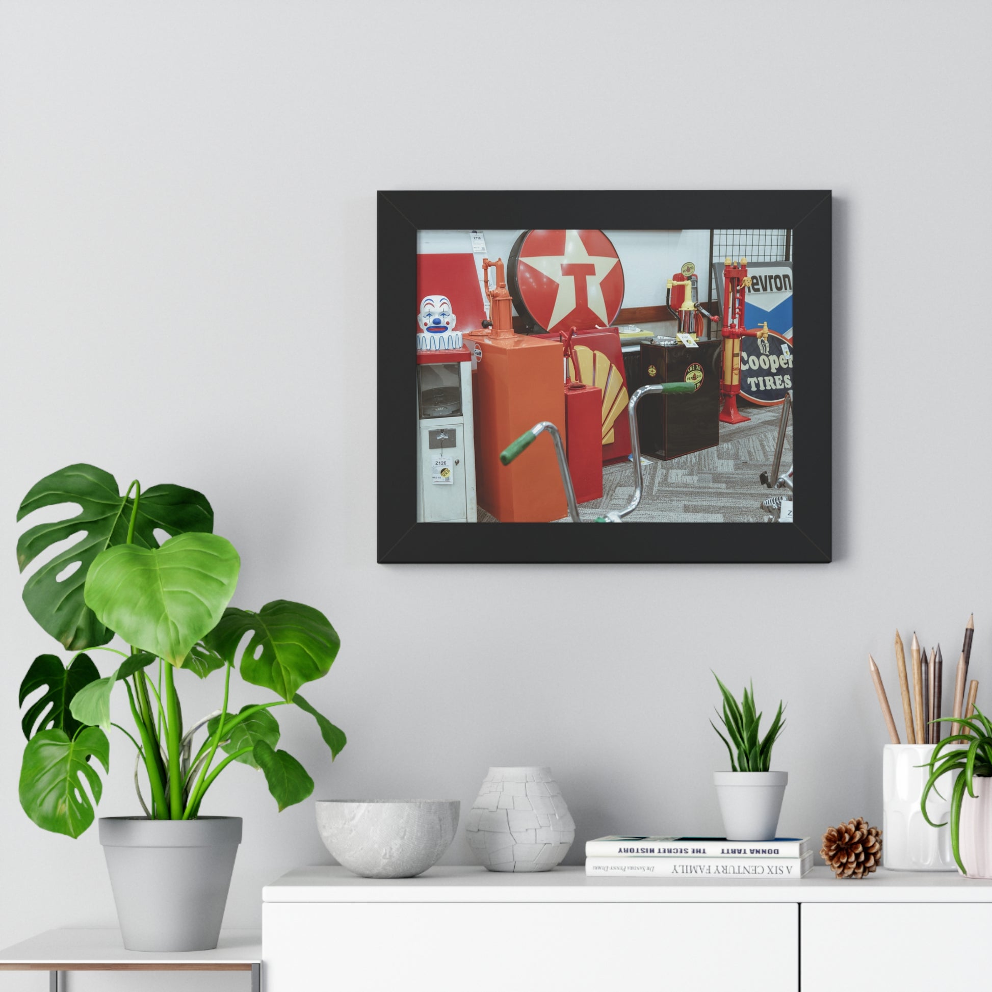 Step back in time with this vibrant photography print showcasing a collection of vintage gas station memorabilia. Featuring iconic signs, retro gas pumps, and whimsical decorations, this image captures the charm and nostalgia of a bygone era in American automotive history. The colorful display, including recognizable brands like Texaco and Shell, creates a unique glimpse into the past, perfect for collectors and enthusiasts alike. Ideal for adding character to your home, office, or garage, this print celebrates the golden age of American motoring.